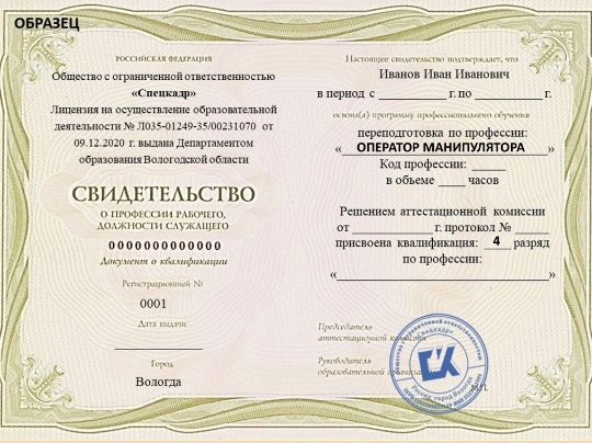 Получить свидетельство о профессии Оператор манипулятора можно после прохождения обучения в лицензированном учебном центре. Курс обучения включает в себя теорию и практику. Мы предлагаем возможность дистанционного обучения без отрыва от работы. Все выдаваемые документы заносятся в «Федеральный реестр сведений о документах об образовании и (или) о квалификации, документах об обучении». Наличие квалификации «Оператор манипулятора» дает право работать на манипуляторах любого типа, марки и производителя.